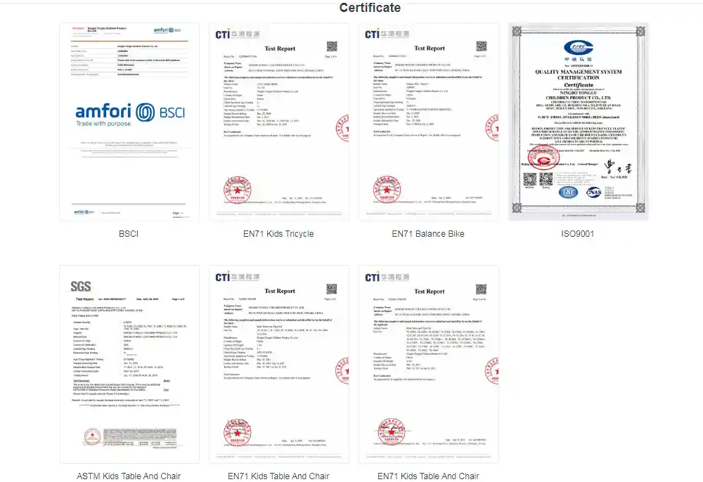 گواهینامه هایی مانندEN71وASTMنشان می دهد که مابچه ها و کودکان نوپا برای تست های تخصصی از نظر غیر سمی بودن مواد، اینکه آیا گوشه ها باعث بریدن دست می شوند و آیا قطعات محکم هستند، انجام شده است و استانداردهای ایمنی را رعایت کرده است.